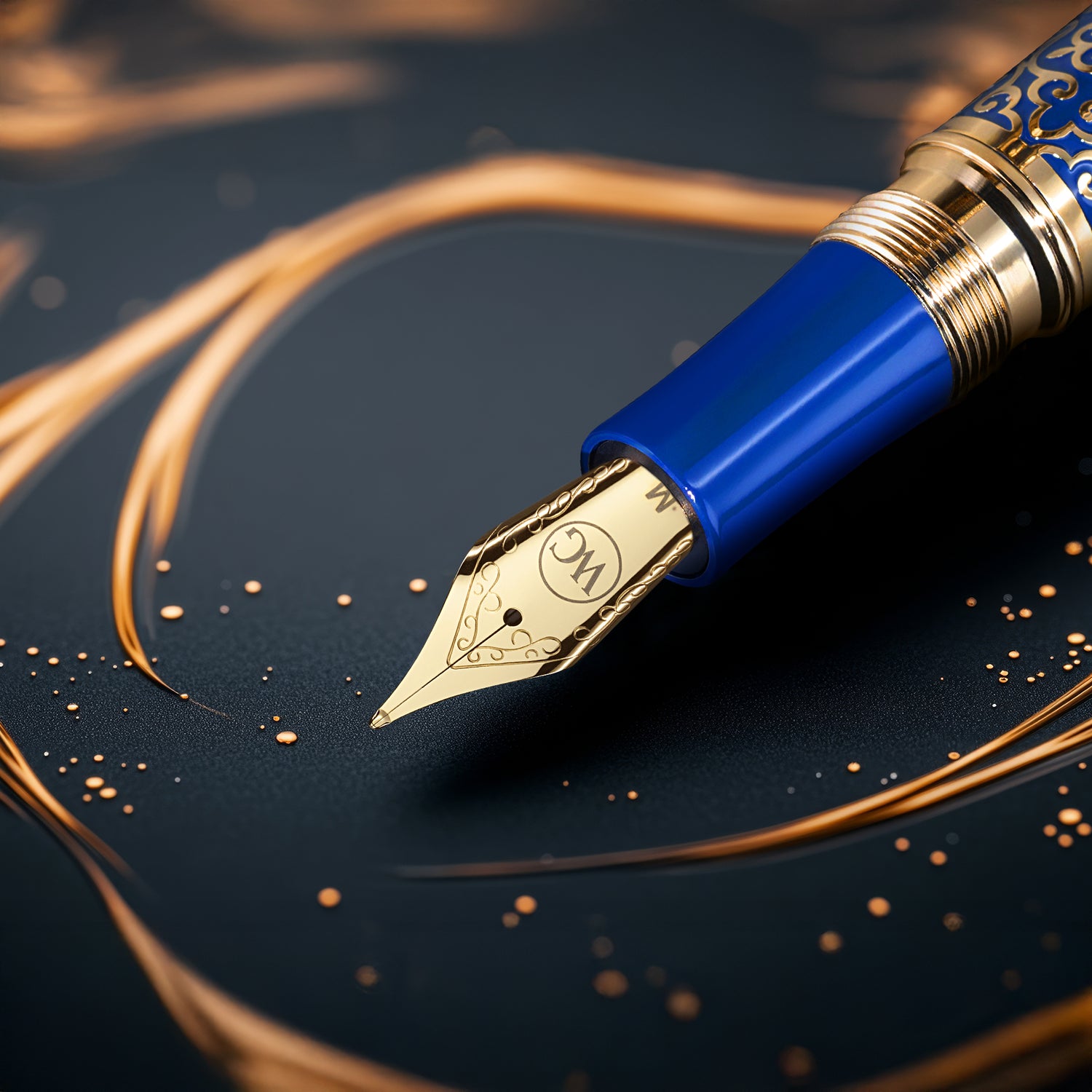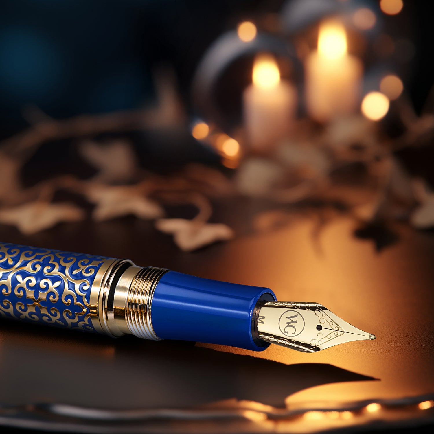 True to its name, The Regal is one of the most opulent and intricately designed creations in Webson Gill's luxury fountain pen collection. Cloaked in a deep royal blue, its precious resin body is adorned with exquisite gold brass filigree, weaving a mesmerizing pattern of curves and spirals. As radiant as the special day you want to commemorate, The Regal is crowned with a gold-toned stainless steel medium nib, expertly crafted for lasting durability and effortless precision. Designed for beauty and functionality, The Regal features a premium Piston Ink Converter System, ensuring a smooth writing experience. This versatile filling system is compatible with a wide range of ink cartridges, including Webson Gill's premium fountain pen inks.