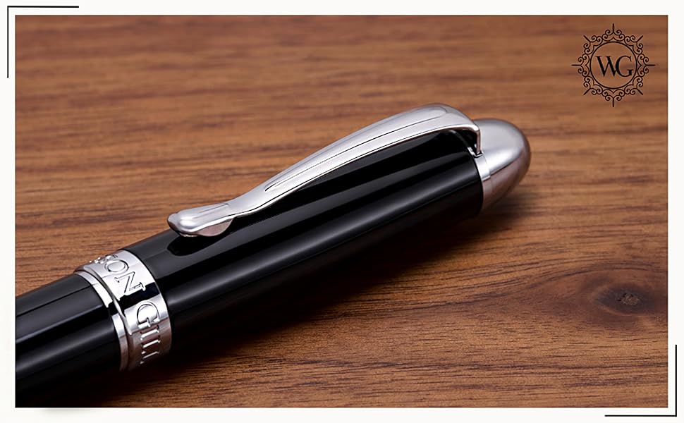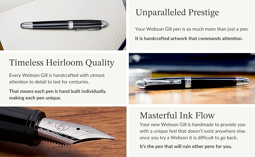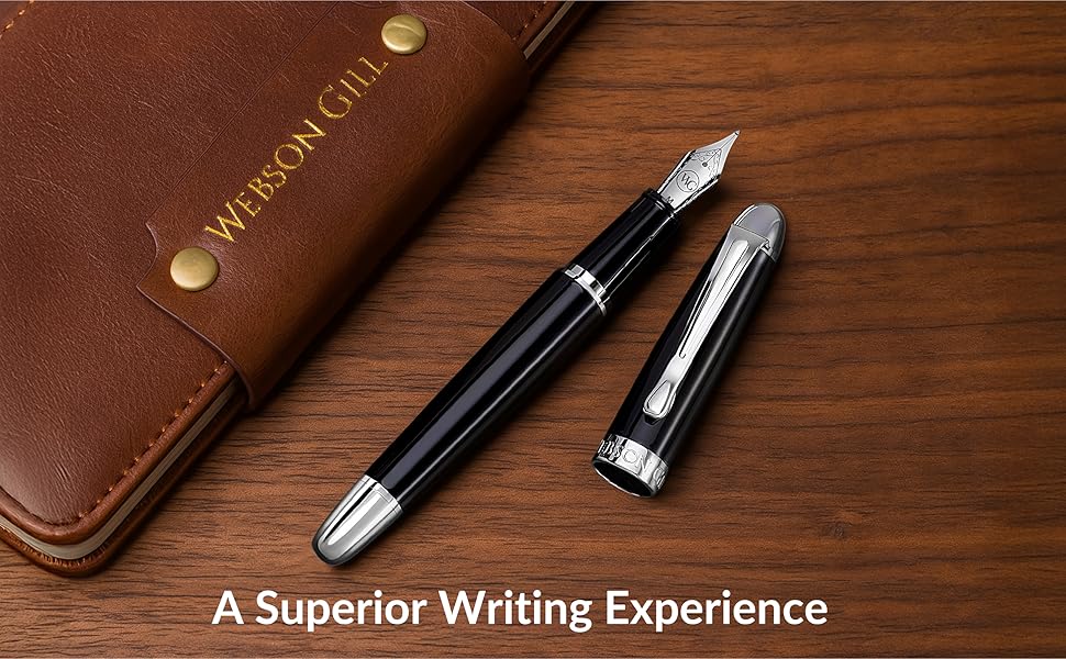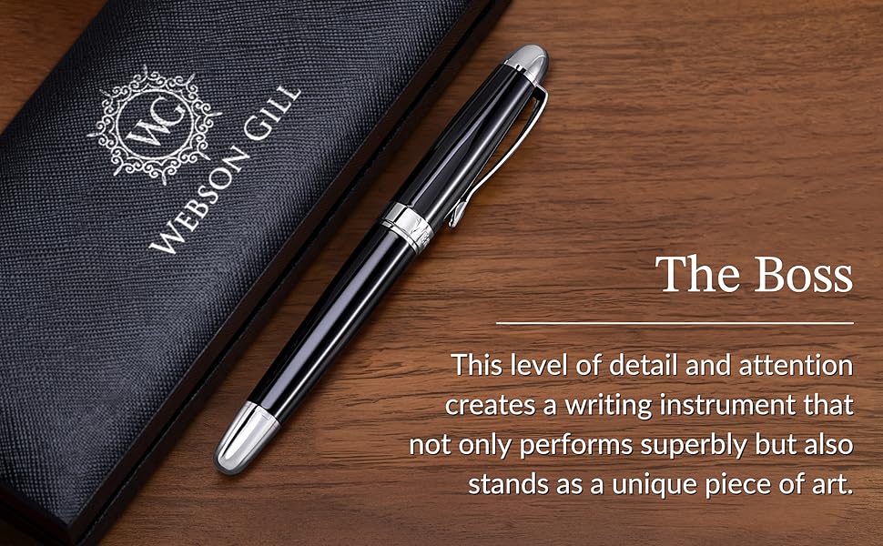 Equipped with a piston ink converter filling mechanism, the Boss offers a convenient and mess-free refilling experience. Its universal compatibility allows users to choose from various inks, including Webson Gill's premium blue and black bottled ink collection. The Boss comes packaged in a sleek, durable black box perfect for gifting and preservation. The stylish box completes its presentation and provides secure storage, keeping the pen protected, whether added to a personal pen collection or gifting a loved one the art of writing.