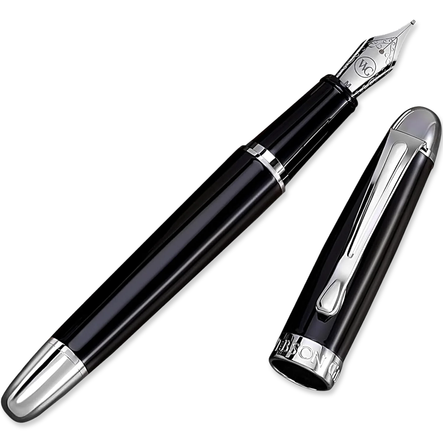 - The Boss fountain pen features elegant chrome accents on the cap, clip, and grip section, adding style and performance. The chrome detailing enhances the pen's premium look, creating a striking contrast against the high-gloss black resin body, resulting in a classic design.